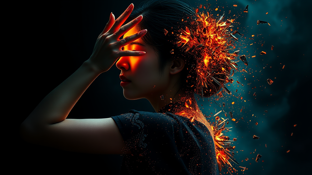A young woman consumed by anguish, her grief palpable as she shields her eyes with hands formed of countless shimmering daggers; her form fracturing into molten lava, disintegrating into the earth below, with shards of her essence evaporating into the atmosphere. Captured in full body side view, the scene is enveloped in shadow, rendered with hyper-realistic detail and an ethereal beauty that defies reality.