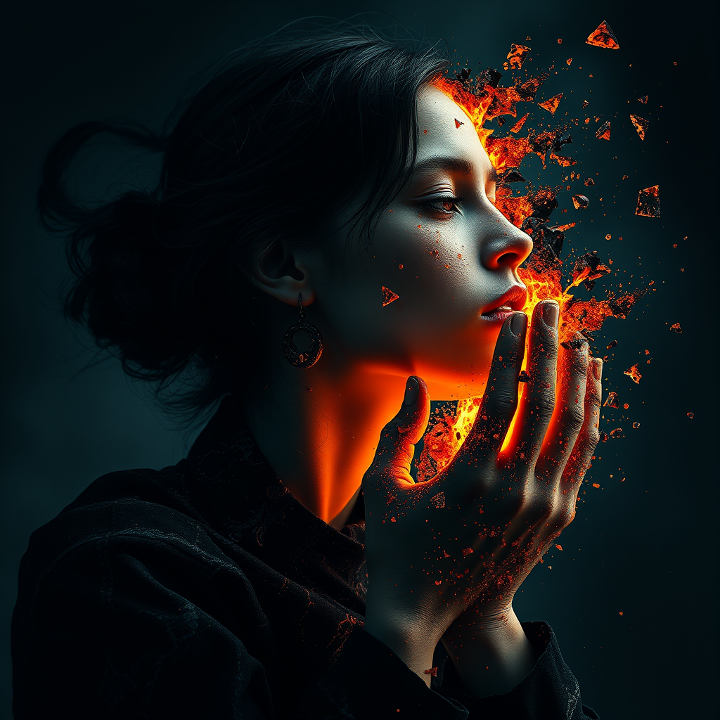 A young woman consumed by anguish, tears hidden beneath her hands forged from countless jagged shards, her form fracturing into molten lava, disintegrating toward the earth, fragments of her essence evaporating into the atmosphere, illuminated in a surreal, hyper-detailed side profile, cloaked in darkness, embodying a haunting beauty, depicted in the realism of an unreal engine, --aspect ratio 9:16 --high chaos 30.