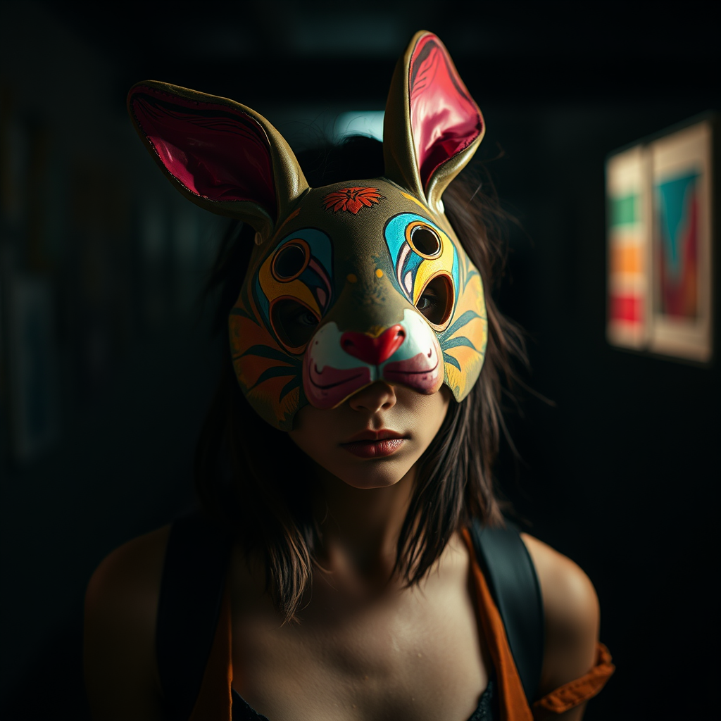 A young woman dons a vibrant, artistically designed rabbit mask in a moody neo-noir setting, exuding an air of mystery. The scene is captured in a soft, diffused light, reminiscent of the works by Alastair Magnaldo, with an edge of David Choe’s urban rawness and a hint of Kehinde Wiley’s bold color palette. The composition is framed in the rich detail of a 70mm lens, showcasing a blend of abstraction and realism in a raw, emotive style. The background is a tapestry of shadow and light, adding depth and intrigue to her enigmatic presence.