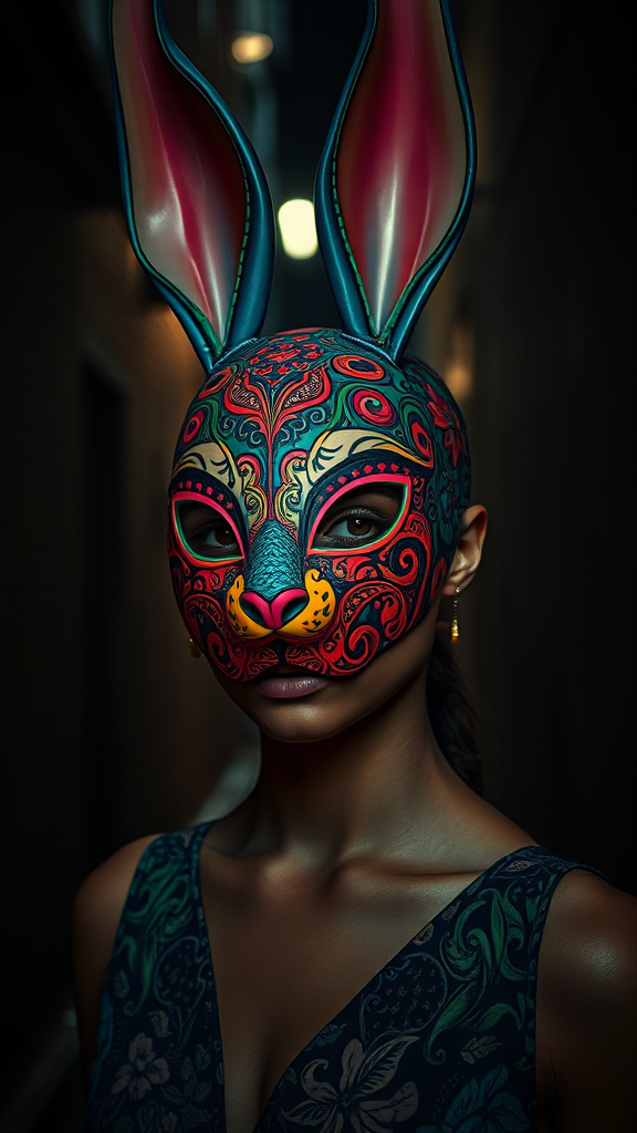 A young woman dons a vibrant rabbit mask adorned with intricate patterns, set against the backdrop of a dimly lit urban alley, capturing the essence of moody neo-noir. The scene is reminiscent of Alastair Magnaldo's surreal compositions with a touch of David Choe's bold artistry and the regal presence in Kehinde Wiley's portraits. Soft, diffused lighting plays across her face, highlighting the mask's vibrant hues, creating a striking contrast with the surrounding shadows. Shot on 70mm, the image boasts a rich, matte finish, emphasizing raw textures and deep colors, evoking an enigmatic, cinematic allure.