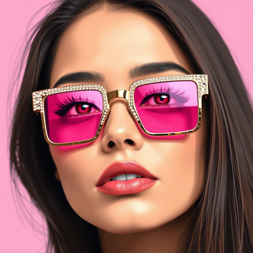 A young woman dons pink-tinted sunglasses with eyes, designed in a style of metallic rectangles, crafted from crystals, influenced by the whimsical art of Melissa Launay, infused with pigeoncore aesthetics, featuring a pixelated, iconic American vibe, with sharp edge clarity.