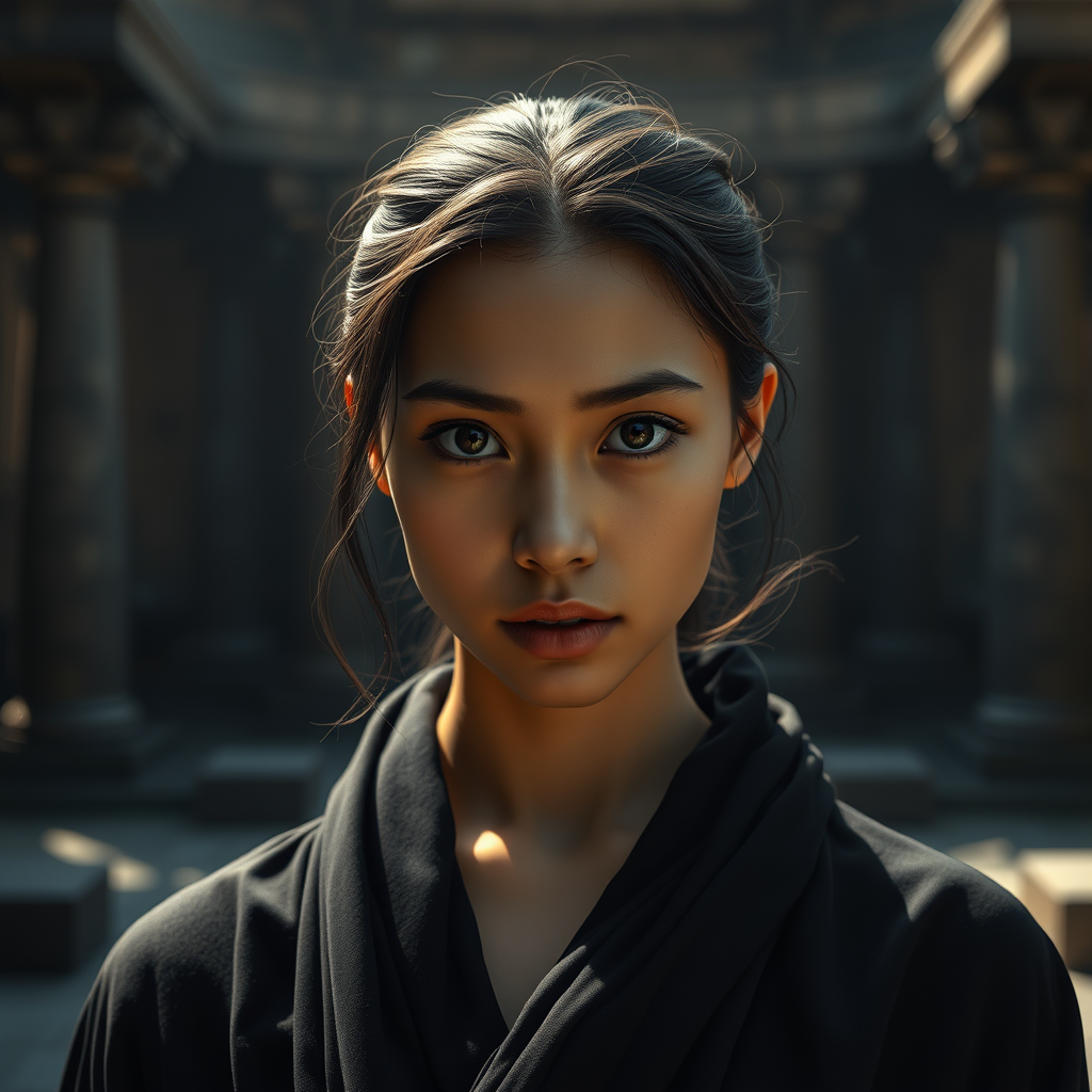 A young woman dressed in dark, flowing robes stands against the backdrop of an ancient temple. Her eyes are symmetrical and framed by dramatic lighting that casts bold shadows. Captured with realistic, sharp focus in high definition, the scene is a hyperrealistic masterpiece with intricate details reminiscent of a photograph enhanced with ray tracing and physics-based rendering. The image is ultra-high resolution, showcasing highly detailed computer-generated artistry capable of serving as an 8K wallpaper. The quality parallels analog realism, avoiding any CGI or digital artifacts. The composition maintains perfect proportions, with natural anatomy and a flawless portrayal, free from deformities or visual errors. The ambient atmosphere invites an immersive experience, as if stepping into an artist's meticulously crafted vision of reality.