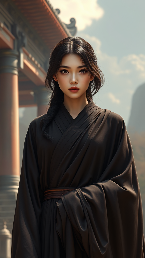 A young woman dressed in dark, flowing robes stands against the backdrop of an ancient temple, her symmetrical eyes capturing attention in the scene's dramatic lighting. The image, rendered in stunning realism and sharp focus, appears like a high-definition, intricately detailed photograph. The hyperrealistic qualities are enhanced through advanced physics-based rendering techniques, offering a unified 8K wallpaper view. The composition showcases ultra-high resolution, with meticulous attention to detail, elevating the digital painting to a hyper-detailed CG masterpiece. Despite its digital creation, the artwork exudes the polish of fine photography, drawing on elements of anime and illustration, while steering clear of any low-quality elements such as text errors or visual artifacts, and maintaining impeccable anatomical accuracy. The character remains beautifully proportioned and the scene's detail invites engagement without distractions.