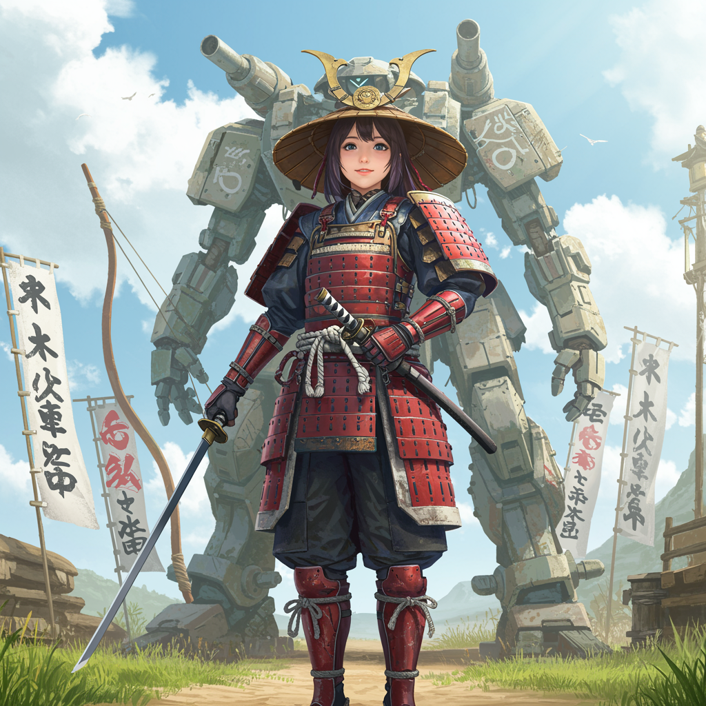 A young woman dressed in elaborate futuristic samurai armor stands confidently with a sleek samurai saber in her hand. She is positioned front and center as if starring in a cinematic movie poster, surrounded by vibrant flags and a traditional bow in the background. Behind her looms an ancient, weathered mech, adding a blend of history and advanced technology to the scene. The atmosphere is set under a bright, sunny sky, capturing the essence of a vibrant anime or manga graphics style. The colors are vivid, rendered with high detail akin to offset printing, creating an 8K, HD image with CMYK precision. Her expression is one of joy, illuminated by natural lighting that enhances the intricate details of her attire, capturing the viewer's attention in a stunning vertical composition.