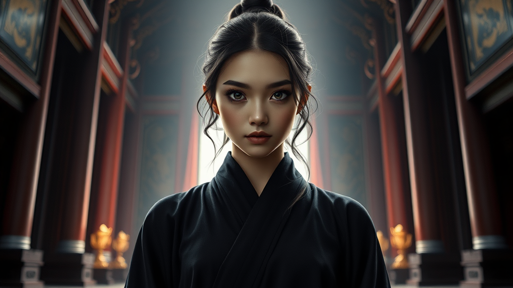 A young woman dressed in elegantly draped dark robes stands within a grand temple setting. Her eyes, perfectly symmetrical, gaze with intensity, enhanced by dramatic, atmospheric lighting that casts intricate shadows. The scene is captured with incredible realism and a sharp focus, achieving high-definition quality akin to a hyperrealistic photograph. Each detail is meticulously intricate, thanks to advanced raytracing and physics-based rendering techniques, resulting in a highly detailed RAW color photograph. The image is designed to serve as an ultra-high resolution, highly detailed 8K wallpaper. The craftsmanship showcases elements of CGI and digital painting, blending aspects of 3D art, anime, and illustration to create a unified and visually compelling piece.