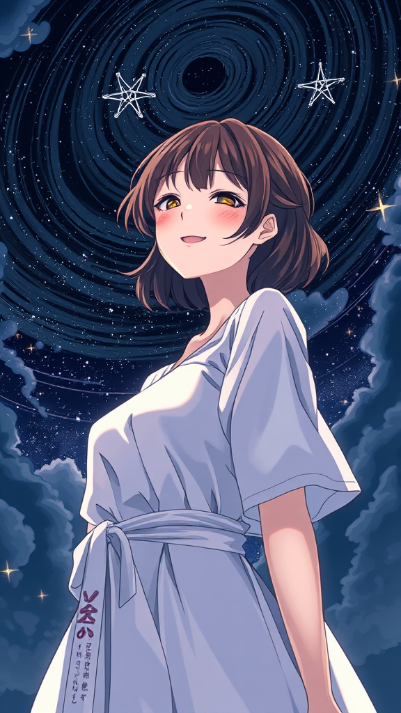 A young woman dressed in ethereal, light garments stands against a backdrop of the starry night sky, her expression conveying pure satisfaction and enjoyment. The scene captures the essence of Oyari Ashito's artistic style, with manga-inspired graphics and anime elements. The dark exposure of the night is contrasted by vibrant, bright colors that highlight her features. The high-quality and highly detailed portrait view emphasizes her serene presence amidst swirling dark clouds, immersing the viewer in an atmospheric, first-person experience.