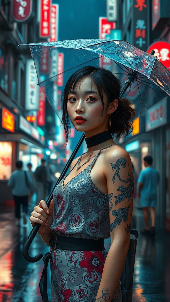 A young woman dressed in stylish urban wear stands in the heart of a futuristic Tokyo, surrounded by neon lights. Her ensemble is a striking blend of contemporary fashion with intricate, highly detailed patterns that echo the essence of Carne Griffiths and Conrad Roset's artistry. The scene is painted in 8k resolution, akin to a masterfully crafted oil painting, capturing a cinematic ambiance. The cityscape around her is alive with vibrancy, heightened by the play of cinematic lighting reflecting off a rain-soaked street, as midnight lends an ethereal glow. Despite the bustling backdrop, she remains the centerpiece, radiating breathtaking beauty with precise lineart. The artwork is void of errors, maintaining high quality without distortions or artifacts. With no anomalies in anatomy or form, her presence is both enchanting and dynamic, offering a snapshot of futuristic elegance. The artwork is a testament to high-resolution artistry, devoid of watermarks or text, encapsulating the soul of a neo-Tokyo night with an umbrella in her hand amidst the rain.