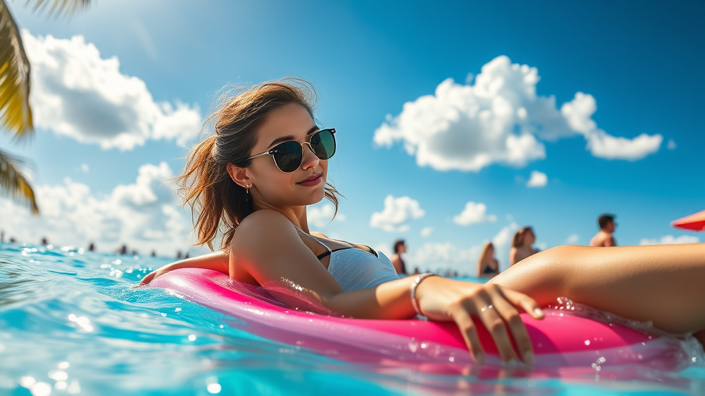 A young woman drifts peacefully on a bright pool float, her fingers skimming the cool, shimmering water under the blazing summer sun, surrounded by the gentle rustling of palm leaves and the distant laughter of friends, as fluffy clouds drift lazily across a brilliant blue sky.