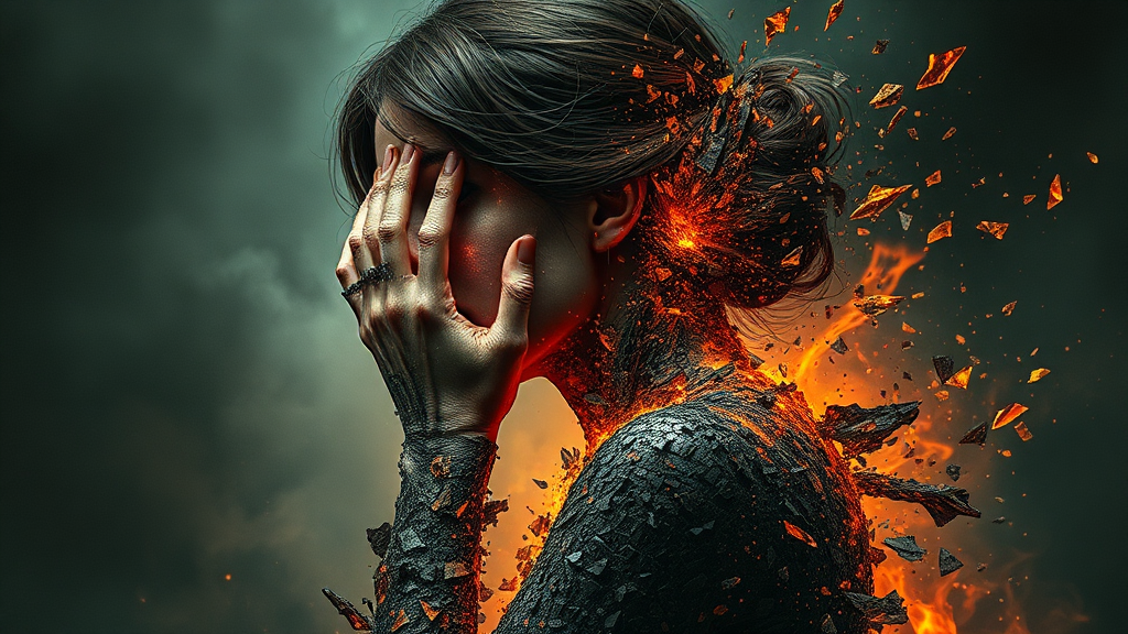 A young woman engulfed in torment, grief-stricken and mourning, her eyes hidden by hands composed of innumerable shards, her body fracturing into molten lava, disintegrating into the earth, fragments of her essence evaporating into the air, full body side perspective, mysterious and visually intricate, enhanced with otherworldly detail, mesmerizing and surreal, striking --ar 9:16 --chaos 30.