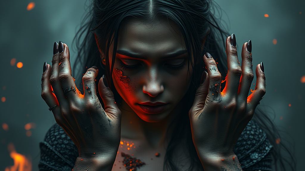 A young woman engulfed in torment, mourning with unbearable grief, her eyes obscured by hands forged from countless daggers, her form crumbling into molten lava, disintegrating into the earth, fragments of her essence evaporating into the atmosphere, full body profile, enveloped in shadow, hyper-realistic detailing, crafted with unreal engine aesthetics, strikingly beautiful, elongated vertical aspect ratio, infused with an aura of chaotic energy.