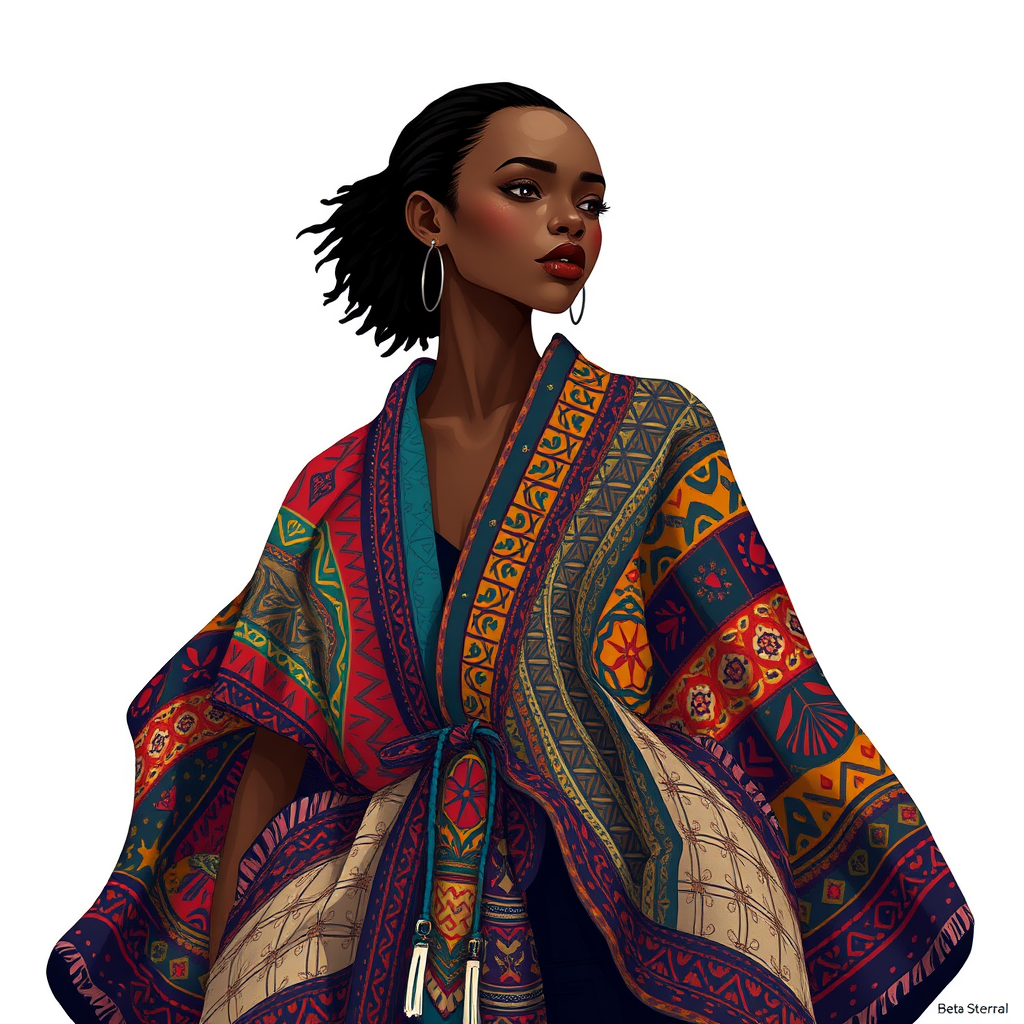 A young woman enveloped in a vibrant, modern poncho jacket with intricate textile patterns and a mix of earthy and bold colors, reminiscent of Duro Olowu's eclectic style. Her fitted frame is juxtaposed with the flowing, layered poncho, inspired by the fluid silhouettes of Yanjun Cheng's digital art. The overall aesthetic is a harmonious blend of trendy internet culture, such as the 'lofi girl' meme, and high-fashion sensibilities. In an approach that defies realities, the scene draws parallels with 3D renderings by Beeple, where the lines between digital and physical blur. Taking cues from the works of Rhads and Lois van Baarle, the illustration bursts with color, recalling the charm of cartoon style and retro anime girls. The overall mood is one of playful individuality, showcasing a confident, modern woman who embodies the spirit of contemporary styles and online cultures, all contained within a singular, carefully crafted image.