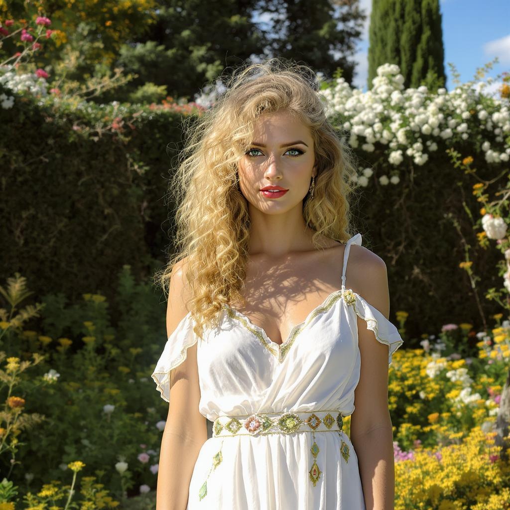 A young woman exuding timeless beauty stands in a lush outdoor garden, her curly blonde hair catching the sunlight and her enchanting green eyes glistening with life. She wears attire reminiscent of ancient elegance, accentuating her grace and poise. It's a sunny day, and the natural lighting casts soft, playful shadows around her, adding depth to the verdant surroundings. Her presence is a harmonious blend of nature and allure, creating an atmosphere that feels both eternal and vibrant.