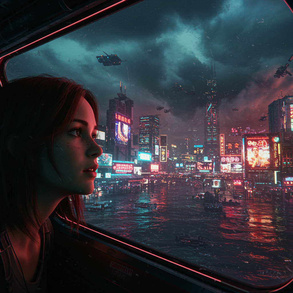 A young woman gazes intently out the window of a sleek spaceship as it glides through a futuristic, neon-drenched cyberpunk cityscape. The urban environment is a vibrant tapestry of towering skyscrapers with cascading holographic advertisements and glowing street signs. Dark clouds loom above, reflecting the iridescent lights below. Inside the ship, the girl's face is illuminated by the ethereal glow of the city's multicolored lights, casting dramatic shadows and accentuating her features. Her expression is a mix of wonder and introspection, as if lost in thought amidst the bustling energy outside. The scene is rendered in ultra high resolution with meticulous detail, showcasing hyper-realistic textures and lifelike shadows. The atmosphere is rich with vivid, contrasting colors that evoke a sense of hyperrealism, immersing the viewer in this expansive dystopian world. The overall composition exudes a cinematic quality, capturing the dichotomy of beauty and chaos within this advanced yet fragmented society.