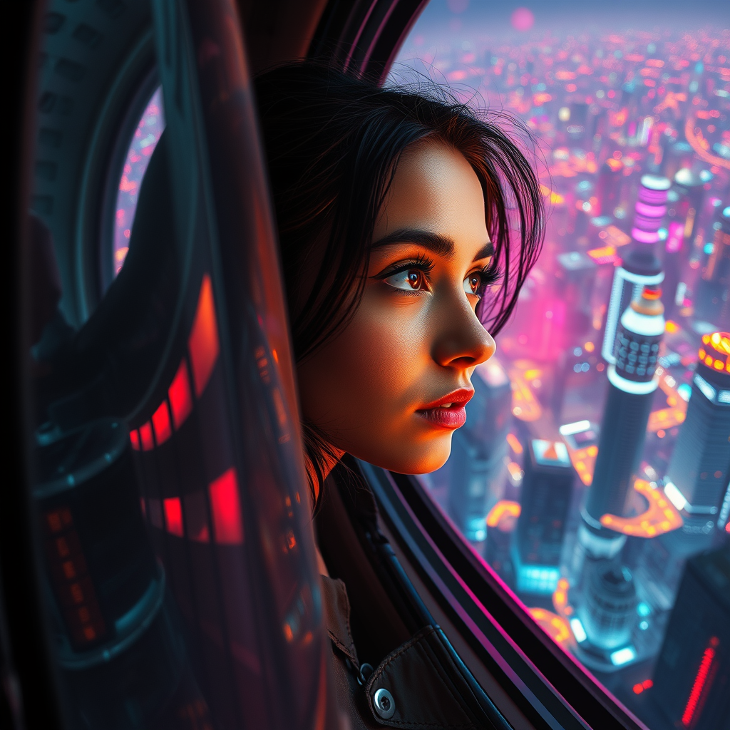 A young woman gazes out from the window of a spacecraft soaring through a sprawling, neon-drenched cyberpunk metropolis. The city pulses with vibrant colors, casting a kaleidoscope of lights on her face, enhancing the intricate details of her expression. The scene is captured in ultra-high resolution, showcasing stunning realism with a lifelike texture and dramatic lighting that heightens the high-contrast and hyperrealistic atmosphere. The visuals echo the sheer realism of a CG-rendered 8K wallpaper, where every pixel contributes to the rich color palette. The surroundings and reflections create an immersive experience, blending physics-based rendering with a sleek, cinematic quality reminiscent of classic cinestill 800 film.