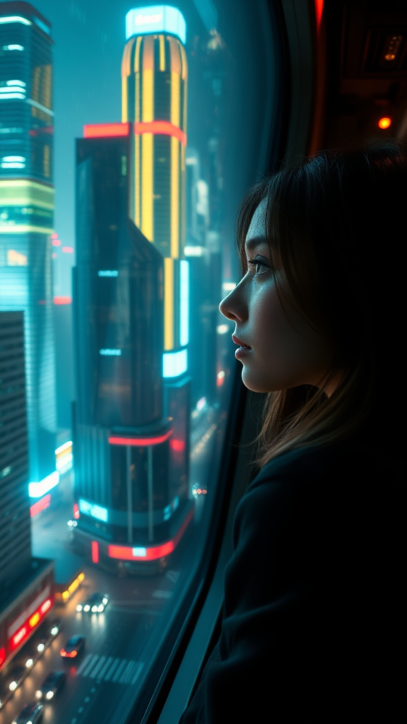A young woman gazes out the window of a sleek spaceship, flying through a sprawling futuristic city bathed in neon glow, where towering skyscrapers cast shimmering reflections on the rain-soaked streets below. Dramatic lighting illuminates her face, creating an ethereal glow against the dark cabin interior of the ship. The scene is captured in stunning high detail, rendering the visual in ultra-high resolution and hyperrealistic textures. The neon-lit cityscape outside is alive with motion and energy, contrasting with the serene and contemplative mood inside. The richness of colors and high contrast enhance the cinematic quality, embodying the cyberpunk aesthetic. The image lacks any imperfections such as low resolution, text overlay, or digital artifacts, achieving a seamless and lifelike representation.