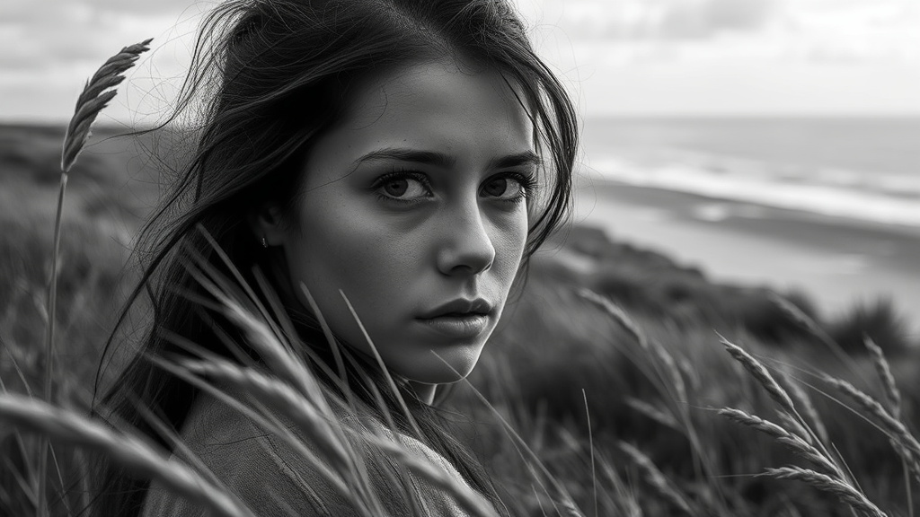 A young woman gazes thoughtfully across the windswept coastal landscape, her expressive features captured in stark black-and-white. The Hasselblad 1600f frames her against a backdrop of rolling Dutch dunes and distant sea. Soft atmospheric elements enhance the mood, while the tall grass ripples around her, echoing the powerful portrait style, emphasizing her contemplative expression amid the serene natural setting.
