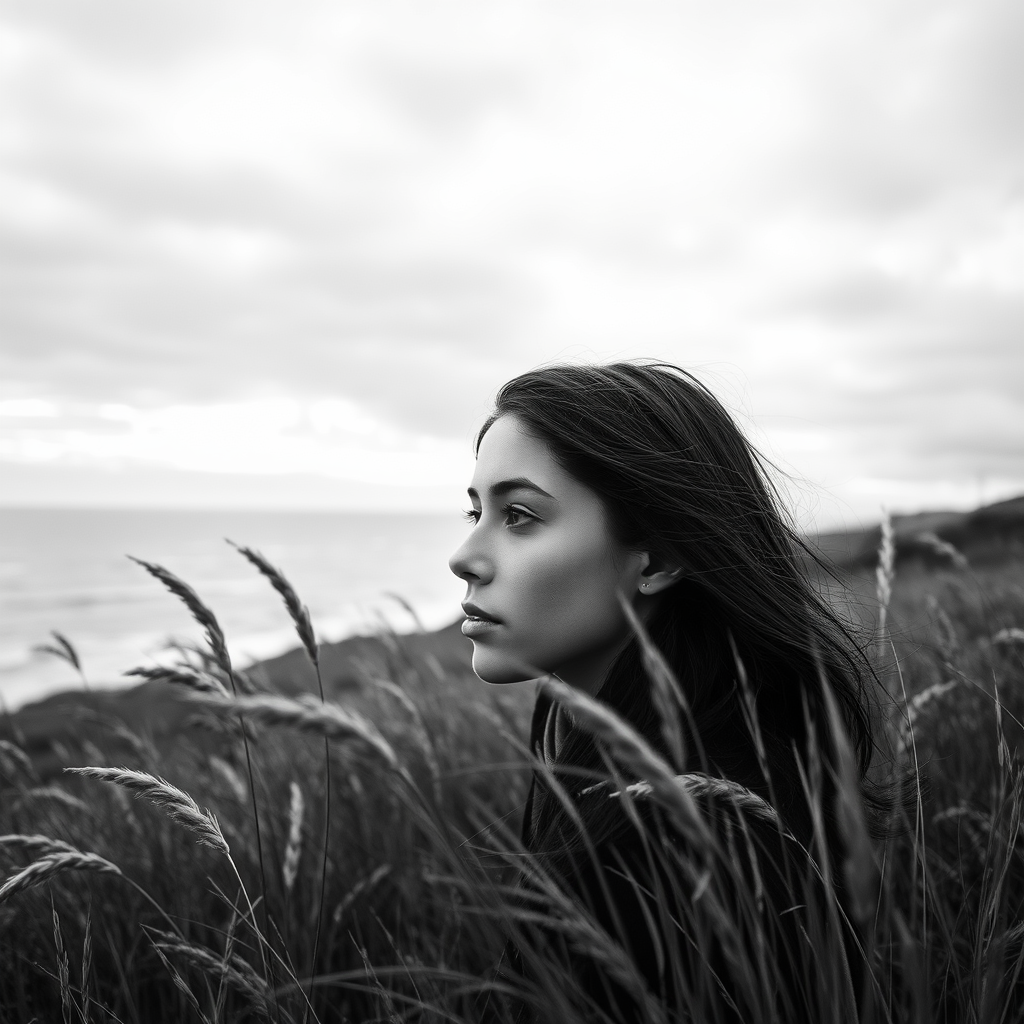 A young woman gazing contemplatively over lush coastal grasslands, captured in the striking style of stark black-and-white photography. Shot with a Hasselblad 1600f, her expressive facial features stand out against the serene backdrop of windswept Dutch landscapes. The scene is softly atmospheric, evoking a sense of gentle tranquility, yet the portrait remains powerful and evocative, as the sea breeze whispers through tall grasses under a vast, moody sky.