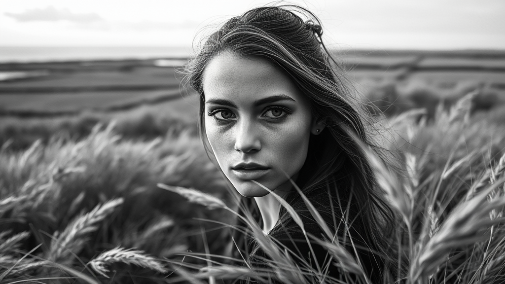 A young woman gazing pensively across windswept coastal grasslands, captured in stark black-and-white photography with precise detailing of the hasselblad 1600f. Her expressive eyes reflect the serene yet powerful atmosphere of the expansive Dutch landscapes behind her. The scene exudes a timeless elegance, with soft atmospheric elements that highlight her striking facial features. The composition is a harmonious blend of powerful portraiture and evocative natural scenery, creating a vivid and contemplative mood.