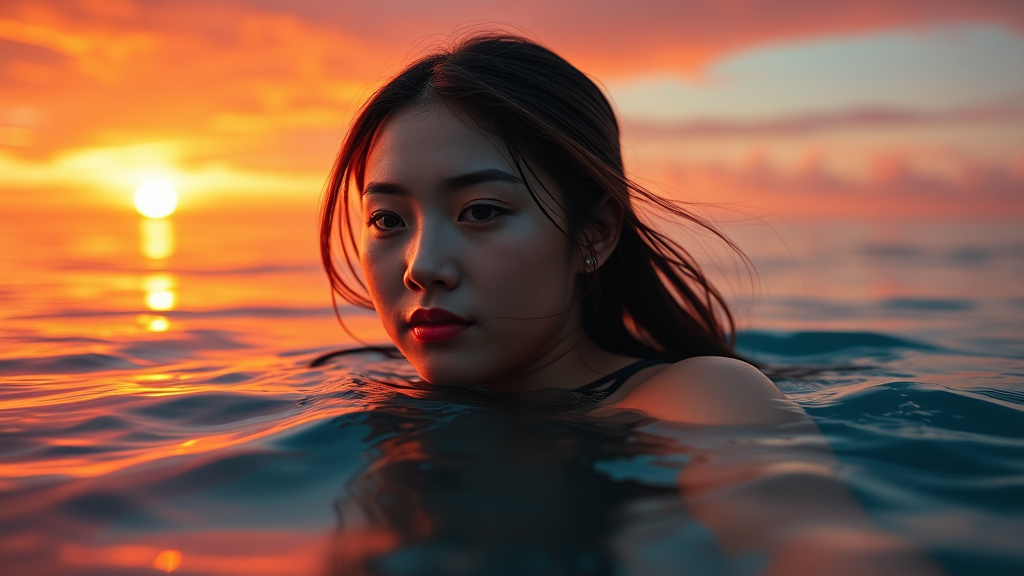 A young woman gracefully immersed in the ocean at sunset, captured in a hyper-realistic portrait style. Her features are finely detailed with a touch of gongbi artistry, with hues of crimson and amber reflecting the fleeting nature of the moment. The image carries a blink-and-you-miss-it detail, evoking the candid charm of a snapshot aesthetic while glowing with a wave of colors synonymous with glowwave aesthetics. The scene embodies a poolcore essence, enhanced by the elongated aspect ratio of 35:64 and an artful infusion of stylization.