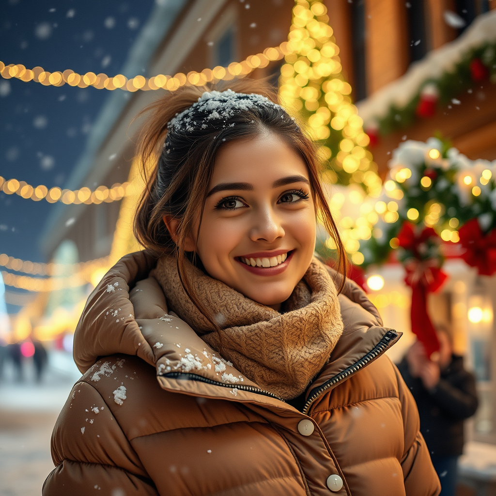 A young woman in a cozy down jacket, surrounded by the festive cheer of Christmas lights and decorations, with a gentle snow falling around her.