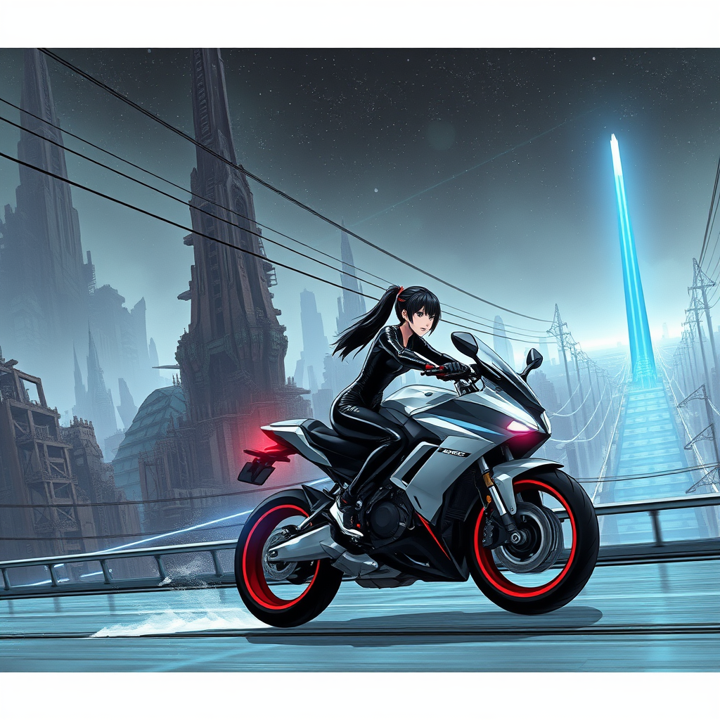 A young woman in a form-fitting, futuristic jumpsuit races across a sprawling bridge on a sleek sci-fi motorcycle. The backdrop reveals a ravaged futuristic cityscape, with towering, decayed skyscrapers reminiscent of a Tsutomu Nihei setting, echoing the vast and dystopian essence of Abara. Massive, behemoth structures loom, filled with layers upon layers of space, exuding a futuristic allure. Neon-lit power lines crisscross like electric veins under a star-studded sky, casting a moody glow over the scene. An intense blue energy beam pulsates in the distance, providing stark contrast beneath the ethereal light of blue neon. The high-definition illustration channels anime and manga artistry, drawing influences from dark exposure techniques and enriched with the vibrancy of 8K clarity. The scene is captured in side profile, showcasing the action and detail of the world, a true testament to the highest quality and intricate design.