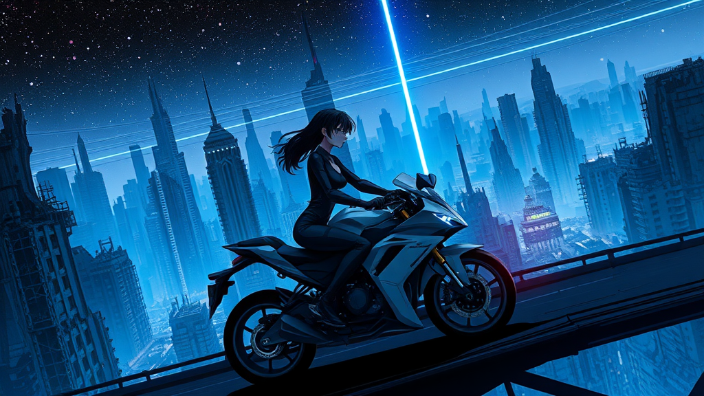 A young woman in a form-fitting futuristic jumpsuit rides a sleek sci-fi motorcycle across a towering bridge, silhouetted against the remnants of a dystopian cityscape filled with colossal, crumbling skyscrapers. The scene captures the essence of a Tsutomu Nihei-inspired world, with its signature gigantism and multi-layered architectural complexity. High above, the night sky is dotted with stars, while neon-illuminated power lines crisscross the urban expanse. A striking blue energy beam arcs across the backdrop, casting a luminous glow on the surroundings. The illustration evokes the dark, intricate style of manga, with emphasis on extreme detail and a rich, atmospheric palette. Bathed in vibrant blue neon light, the scene is captured in side view, offering an 8K, Full-HD quality experience that blends the essence of anime drawing with high-resolution realism, exuding a sense of futuristic exploration.