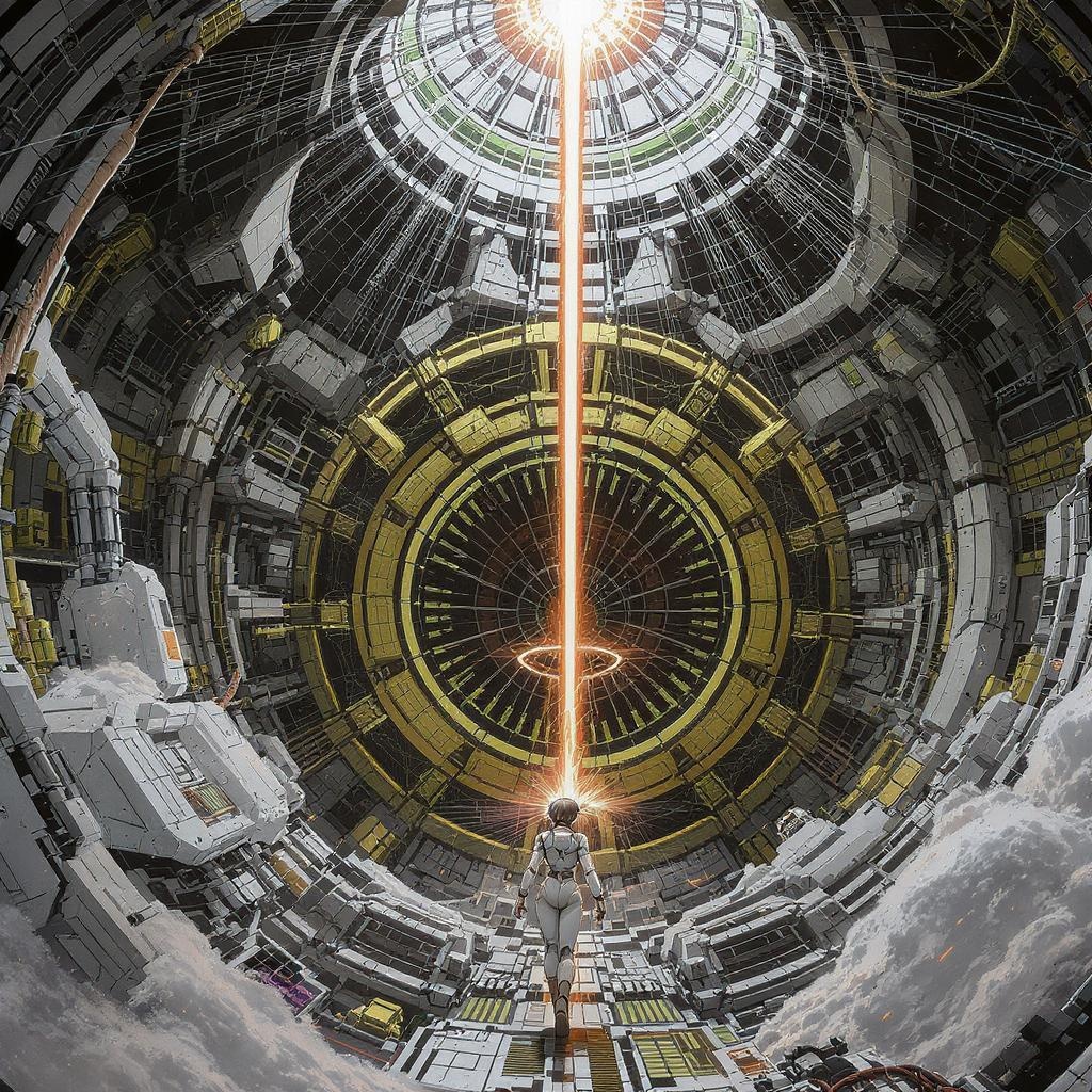 A young woman in a futuristic spacesuit navigates the vast interior of a sprawling spaceship, reminiscent of Tsutomu Nihei's style in Sidonia no Kishi. Enormous structures tower around her, housing a massive laser generator at the core. This multi-level space feels both expansive and claustrophobic, crafted with hyper-detailed sci-fi aesthetics. A central laser beam pierces upwards, splitting into radiant energy clots that illuminate the surroundings with blinding flashes of light and speed. The scene captures a moment of intense acceleration, blending the essence of anime and manga graphics with ultra-high resolution imagery, showcasing intricate line work and dynamic perspectives.