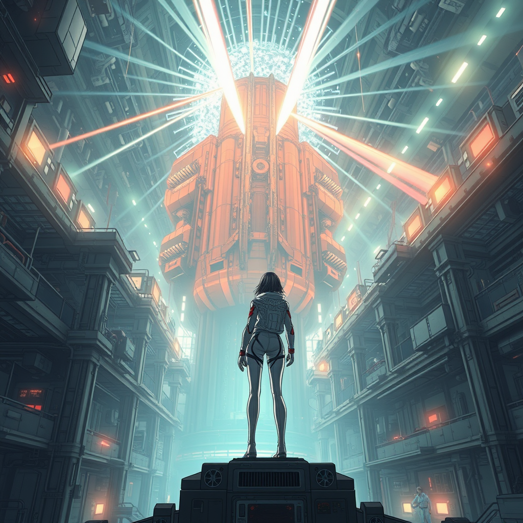 A young woman in a futuristic spacesuit stands within the cavernous interior of a spaceship, inspired by Tsutomu Nihei's distinctive style from Sidonia no Kishi. The scene features elements of gigantism, with towering structures and machinery enveloping the multi-story space, each detail rendered in hyper-detail. At the center, a massive laser generator hums with energy, casting laser beams upwards, merging with beams from the sky, forming intricate energy clots. The environment sparkles with bursts of light, acceleration, and speed conveyed through dynamic lines. The artwork, rich with the anime's aesthetic, offers an 8K high-definition experience, blending manga-inspired graphics with first-person perspective, resulting in a visually arresting exploration of futuristic sci-fi themes.