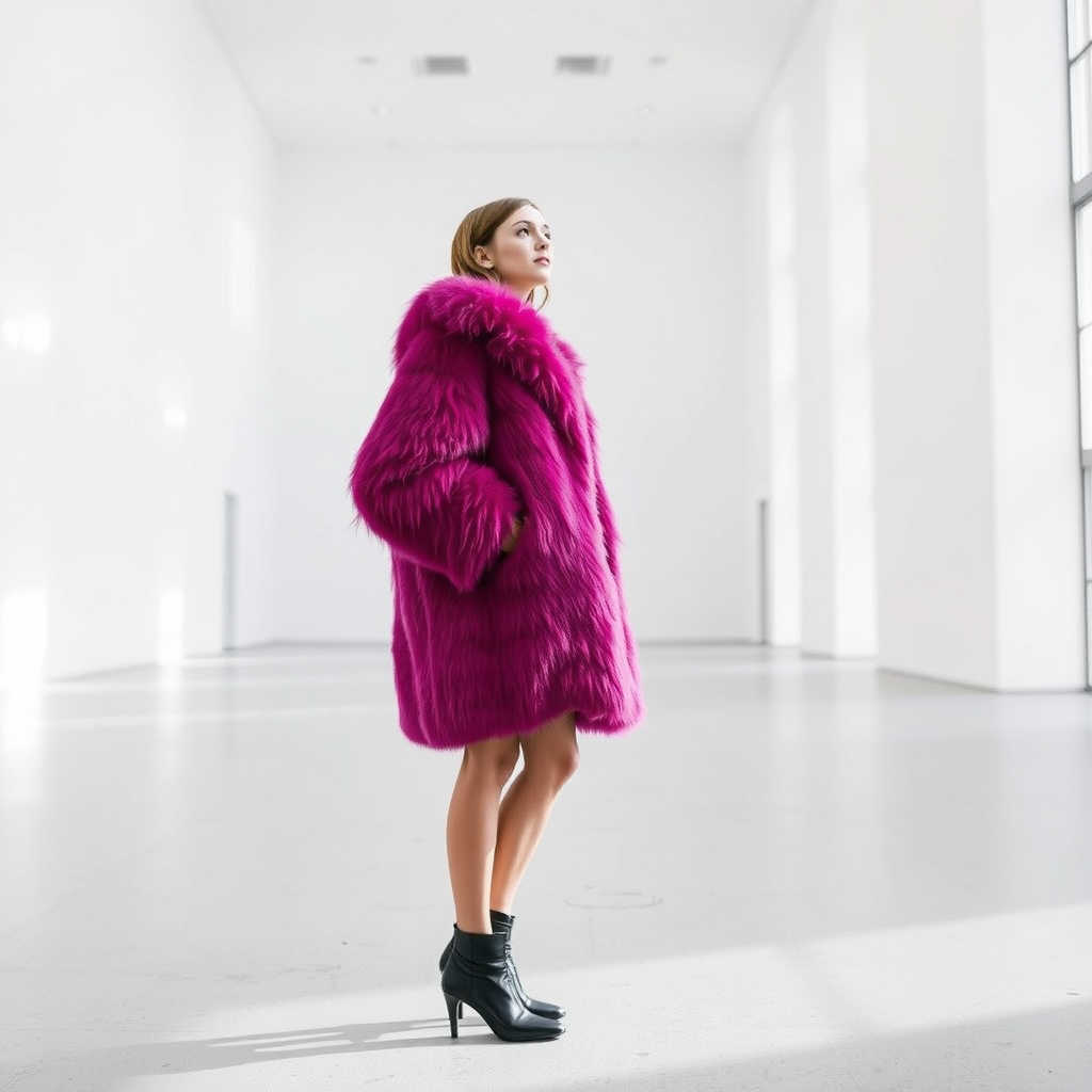 A young woman in a luxurious, oversized jacket stands gracefully on the right side of an expansive, minimalist museum hall, her gaze directed thoughtfully towards the large windows. The room's stark white interior highlights her vibrant attire, creating a striking visual contrast in this elegant fashion photography setting. Soft natural light streams in, casting delicate shadows and emphasizing the texture of her fluffy coat, as she exudes a sense of contemplation and style in the serene and open space.