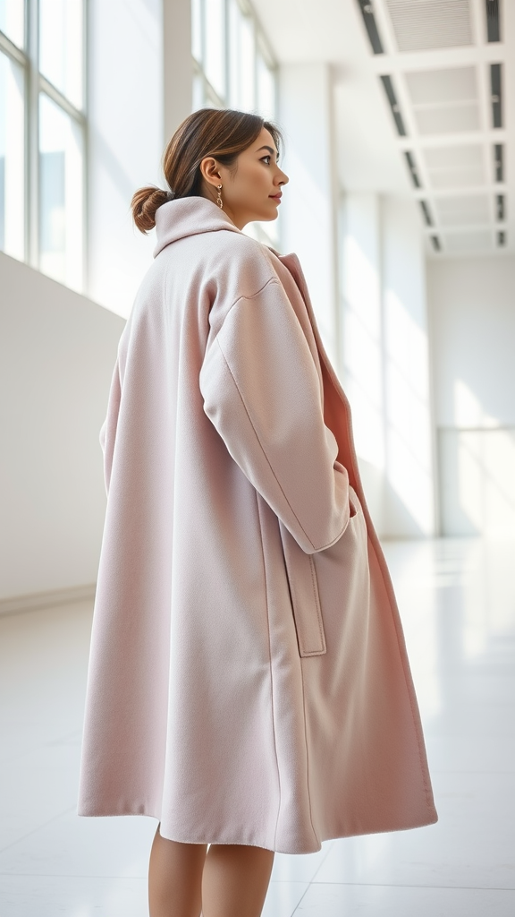 A young woman in a luxurious, oversized pastel coat stands gracefully on the right side of an expansive, bright white museum hall, gazing thoughtfully out of a large window; soft natural light illuminates the scene, highlighting the delicate textures of her attire in this modern, minimalist setting.