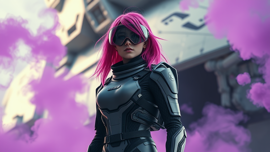 A young woman in a sleek, advanced space suit stands alone against the backdrop of a massive spaceship, her vibrant pink hair contrasting with the sci-fi setting. Wisps of mesmerizing purple smoke envelop her, adding an air of mystery. Her full body is visible, and the scene is captured with photorealistic detail, enhanced by cinematic lighting. Sharp reflections on her visor and suit highlight the cutting-edge technology, reminiscent of Unreal Engine 5's visual prowess.