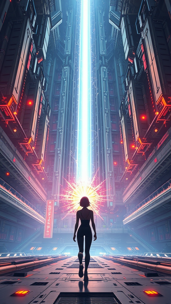 A young woman in a sleek, form-fitting jumpsuit navigates the vast interior of a futuristic spaceship. The design mirrors the intricate style of Tsutomu Nihei, reminiscent of Sidonia no Kishi, with towering structures and an overwhelming sense of gigantism. In the heart of this multi-level space, a colossal laser generator hums with power, casting a vivid beam of energy from its core, stretching up towards the heavens. Energy clots orbit around the laser, crackling with intensity, as flashes of light illuminate the scene. The setting is dynamic, driven by acceleration and speed, capturing the essence of high-energy sci-fi. The environment is illustrated with hyper-detail, merging anime aesthetics with manga graphics, offering an immersive, first-person view. The artwork, rendered in ultra-high-definition, embraces 8K super-resolution to reveal every intricate detail, immersing the viewer in a dazzling display of futuristic technology and creativity.