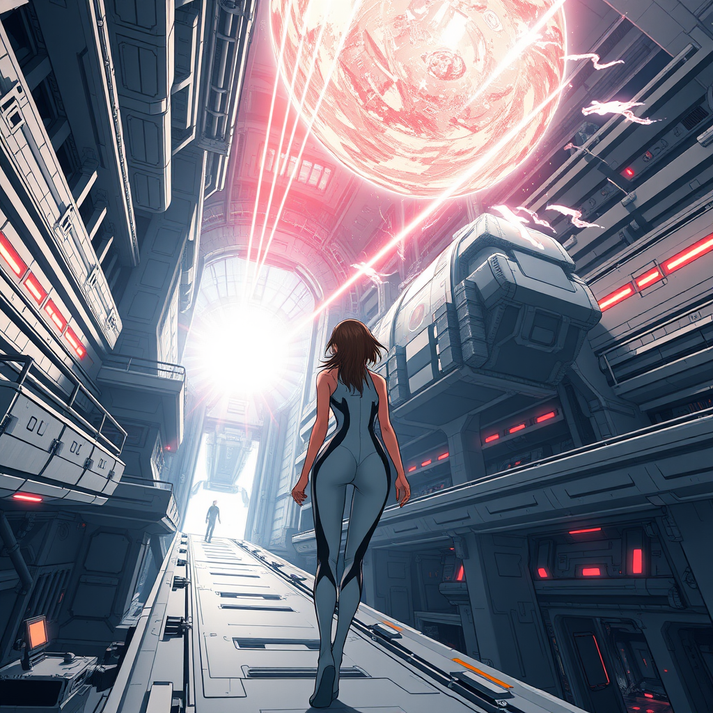 A young woman in a sleek, form-fitting jumpsuit navigates the expansive interior of a futuristic spaceship, reminiscent of Tsutomu Nihei's distinct style, particularly evoking the grandiose elements of Sidonia no Kishi. The environment is dominated by a multi-level architectural grandeur, where mechanized structures dwarf human scale, emphasizing a sense of gigantism. At the heart of the space lies a colossal laser generator, pulsating with energy, shooting beams skyward and casting dynamic shadows. This central laser interacts with swirling energy clots, which randomly unleash powerful flashes and surges of light, reflecting the continual acceleration of the ship within the vastness of space. Rendered in high definition, the scene captures intricate details typical of manga graphics, presenting a hyper-detailed, 8K illustration that blends anime aesthetics with sci-fi innovation. The perspective is immersive, drawing the viewer into an engaging first-person experience, capturing the pulsating vibrancy and speed of this advanced, animated world.