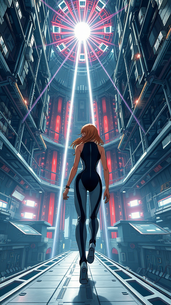 A young woman in a sleek, form-fitting jumpsuit navigates the expansive interior of a spacecraft, reminiscent of Tsutomu Nihei's distinctive style. The setting evokes the grand scale and intricate design of "Sidonia no Kishi," with towering structures and complex technology. A massive laser generator dominates the multi-level space, emanating beams that pierce through the environment with intense energy. The futuristic aesthetic is evident in the hyper-detailed elements, capturing the essence of sci-fi with a touch of realism. Brilliant light flashes illuminate the scene as the laser originates from a point above, creating a spectacle of energy clots and acceleration. The composition conveys a sense of speed and dynamic movement, akin to anime and manga graphics, rendered in 8K resolution for crisp, high-definition detail. The perspective gives a first-person view of this intricate and visually stunning world, immersing the observer in a super-resolution, anime-inspired, futuristic narrative.