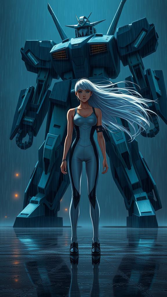 A young woman in a sleek, form-fitting jumpsuit stands defiantly in front of a towering mecha, her long, silvery hair flowing dramatically in the stormy night wind. The scene is set against a dark, rain-soaked backdrop, with droplets glistening as they catch the dim light. She stands solitary and resolute, gazing up at the enormous machine. The atmosphere is cinematic and richly detailed, exuding a sense of awe and wonder. The environment is stunning, with a smooth, reflective surface beneath her feet and a surreal, almost divine ambiance. The imagery is inspired by manga and CGI artistry, capturing the essence of a 3D-rendered masterpiece, evoking the feel of a dreamlike, celestial encounter amidst a larger-than-life setting. The air feels charged with an otherworldly energy, as if stepping into a reality where fantasy and reality blur seamlessly.