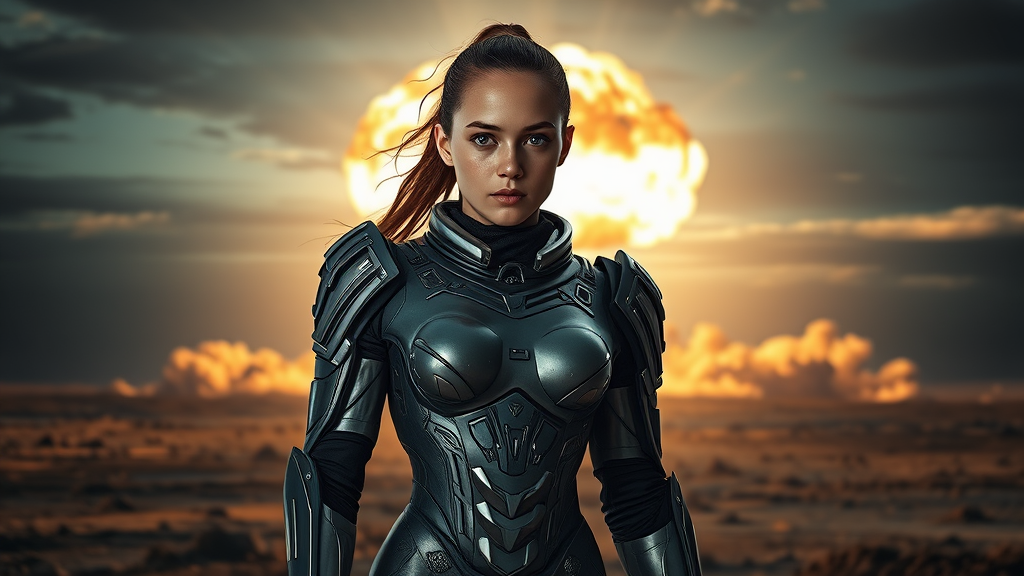 A young woman in a sleek, futuristic exo-suit, her armor glinting with intricate, reflective patterns, stands poised against the backdrop of a massive nuclear explosion. The mushroom cloud rises ominously, casting shadows over the landscape as the powerful blast wave sweeps across the terrain, stirring up nuclear ash. Her expression is focused, embodying a mix of determination and resilience. The scene teems with hyper-realistic detail, capturing every nuance of the intense light flash and acceleration from the explosion. It's presented in a photorealistic, cinematic style, emphasizing complex lighting and dynamic staging. The image is rendered in ultra-high definition, creating an immersive experience that highlights the futuristic science fiction setting with long exposure effects and an 8K resolution brilliance.