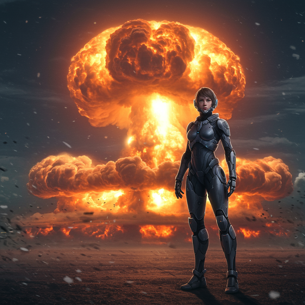 A young woman in a sleek, futuristic exo-suit stands resolutely against the backdrop of a massive, swirling nuclear explosion. Her sci-fi armor glints in the vivid light of the blast wave, while nuclear ash drifts around her like snow. The dramatic nuclear mushroom cloud looms behind her, casting ominous shadows that play across the scene. The image is rendered in stunning detail, showcasing hyper-realism and photorealism in 8K UHD, capturing the intricate design of the armor with its complex lighting effects. A sense of motion and speed is evoked through dynamic, long exposure elements, evoking a cinematic quality. The artwork is meticulously staged, with a focus on the acceleration of the unfolding events, delivering a breathtaking depiction in the vivid, expansive style of science fiction.