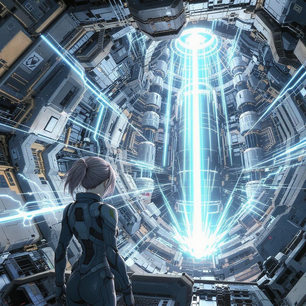 A young woman in a sleek, futuristic spacesuit stands inside the cavernous interior of a massive spaceship, evoking the intricate style of Tsutomu Nihei and the epic scale of Sidonia no Kishi. The space is dominated by multi-story structures and a colossal laser generator at the center, emitting beams that seem to connect the ship to the distant ceiling. The ambience has a sense of gigantism, with energy clots pulsating and accelerating through the ship's networks. The scene is captured in stunning hyper detail, akin to a high-definition anime drawing, showcasing vibrant manga graphics. Outside, a powerful laser descends from the sky, illuminating the entire scene with a blinding flash of light, conveying a sense of immense speed and energy. The perspective is immersive, as if seen through the eyes of one within this captivating sci-fi world.