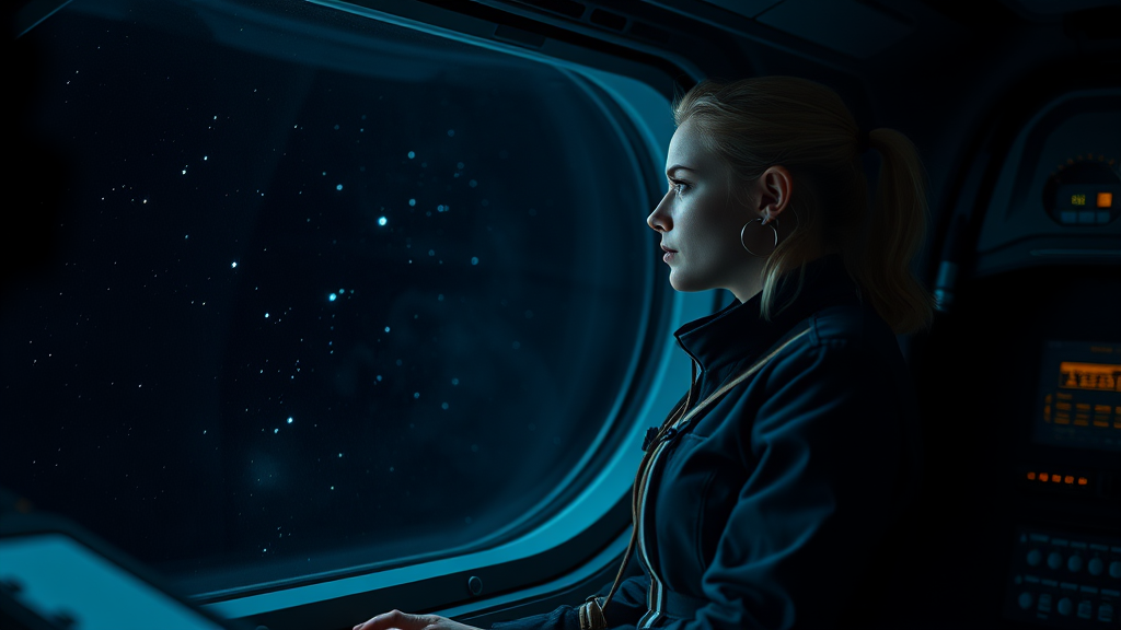 A young woman in a sleek jumpsuit gazes thoughtfully out the window of a spacecraft as distant stars twinkle in the vastness of space. Despite the dim lighting inside the ship, her curious expression is illuminated gently by the soft glow of the control panel. The scene evokes a sense of wonder and exploration, emphasizing her connection to the unknown cosmos.