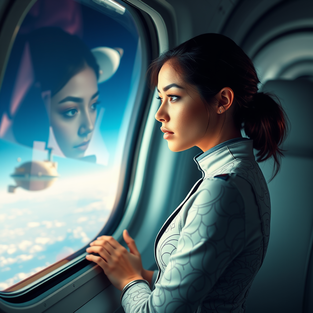 A young woman in a sleek jumpsuit gazes thoughtfully out the window of a spaceship. The scene is slightly pixelated, with an air of digital imperfection. Her reflections on the glass appear fragmented, adding a surreal element. Her silhouette is softened, with subtle color gradations, suggesting an ethereal quality. The jumpsuit has intricate patterns, and her features, though slightly blurred, convey a sense of curiosity and wonder. The overall composition hints at futuristic travel with a touch of dreamy abstraction.