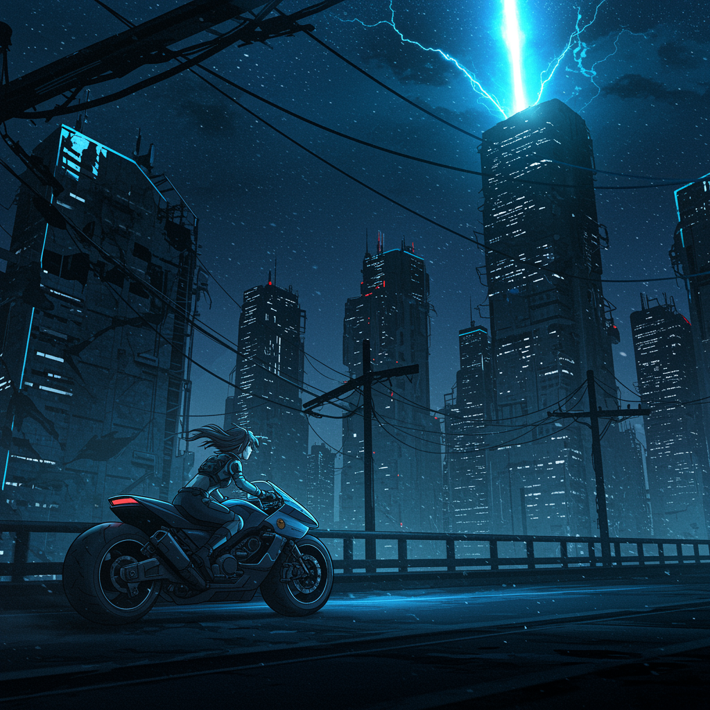 A young woman in a sleek sci-fi jumpsuit astride a futuristic motorbike speeds across a vast bridge, set against the backdrop of a ruined sci-fi metropolis. Towering skyscrapers stretch into the night, their structures echoing Tsutomu Nihei's signature style with elements of abara influence, showcasing grandiose architecture and multi-layered space. The scene is enveloped in a dark, atmospheric glow as neon-illuminated power lines crisscross above, casting vibrant reflections. Above, a starry night sky stretches out, accentuated by a vivid blue energy beam piercing through, adding a dynamic tension to the backdrop. The entire composition embraces manga-like graphics with a dark, yet vividly colorful exposure, infused with blue neon hues. The view is portrayed from the side, offering an 8K, Full-HD level of detail and quality, capturing the essence of futuristic anime art.