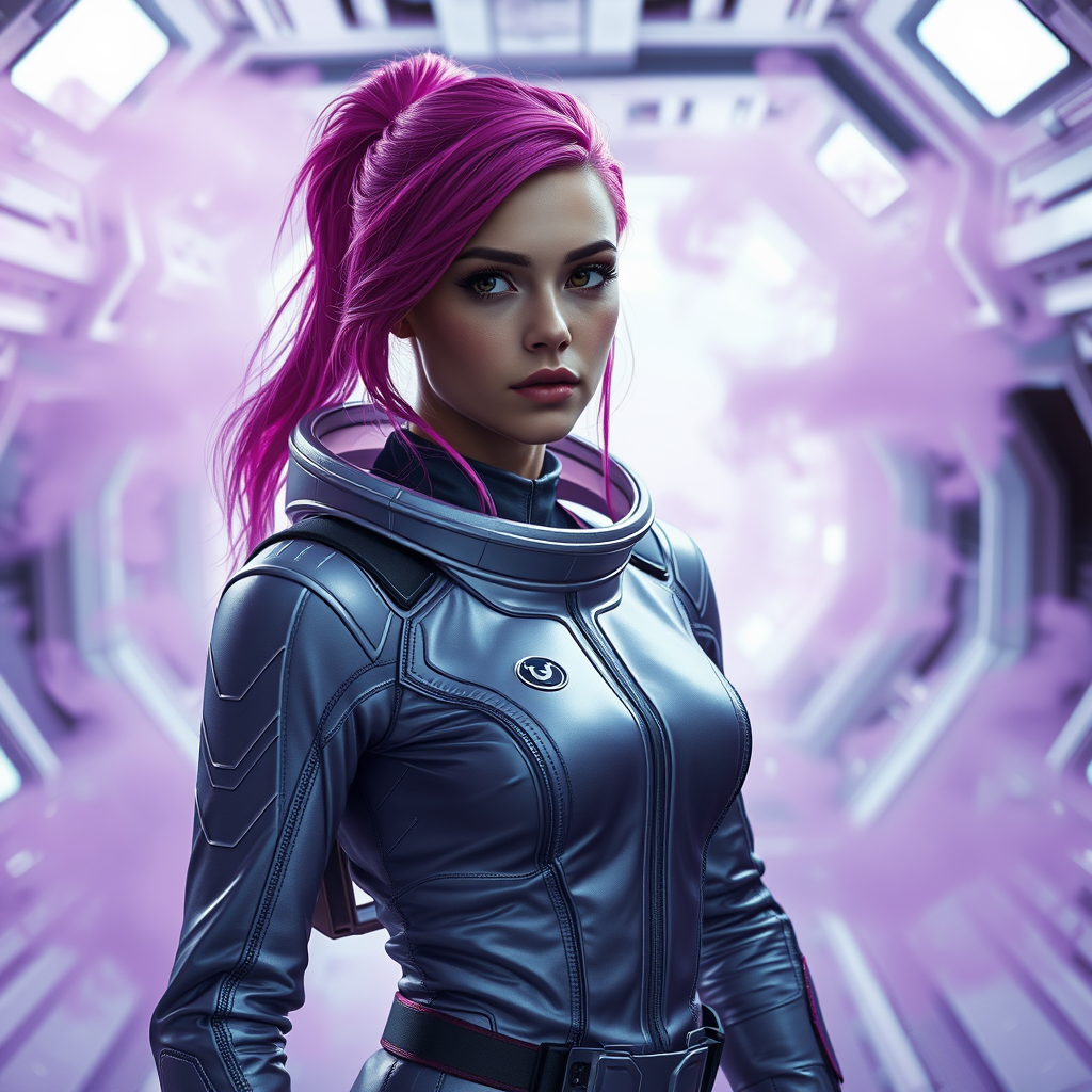A young woman in a sleek space suit stands alone amidst the futuristic backdrop of a spaceship. Her vibrant pink hair contrasts with the soft, swirling purple smoke that envelops the scene. Her eyes are fixed on the horizon, reflecting a sharp gleam of determination. The environment is rendered in photorealistic detail, with cinematic lighting casting dramatic shadows and highlights. The metallic surfaces around her glisten with the precise reflections typical of Unreal Engine 5, enhancing the sense of isolation and wonder in this sci-fi setting.
