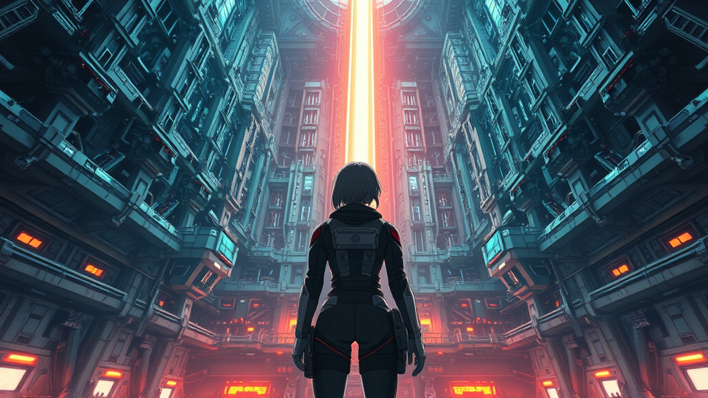 A young woman in a sleek spacesuit stands inside an enormous spaceship, her surroundings inspired by the Tsutomu Nihei style reminiscent of Sidonia no Kishi. Vast multi-story structures tower around her, emphasizing a sense of gigantism and advanced technology. In the center of the scene, a colossal laser generator hums with energy, casting a vibrant beam of light upwards, penetrating through levels of the ship and beyond. The atmosphere is charged with futuristic sci-fi elements, hyper-detailed with anime and manga aesthetics. Flashes of energy clots cascade around, hinting at incredible speed and acceleration as the ship navigates through the cosmos. Her perspective captures the intricately designed interior, showcasing high-definition resolution and 8K quality, emphasizing the super resolution and dynamic visuals of the spacefaring environment.