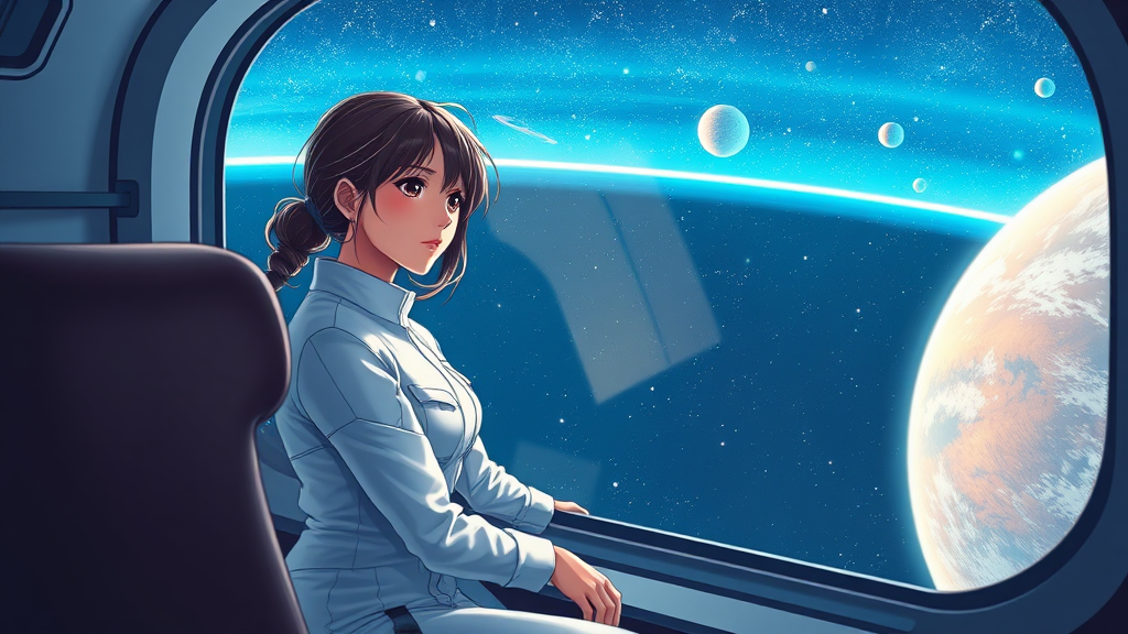 A young woman in a sleek white jumpsuit gazes out the window of a spaceship, capturing an anime and manga-inspired scene. The digital painting evokes a sense of adventure and future exploration. Her expression is serene and reflective as the stars and planets stretch across the cosmic landscape. Her presence exudes a sense of curiosity and wonder, embodying the spirit of exploration. Despite the galactic setting, an element of human connection and emotion gently grounds the scene, emphasizing the intricate details of the universe outside the spacecraft.