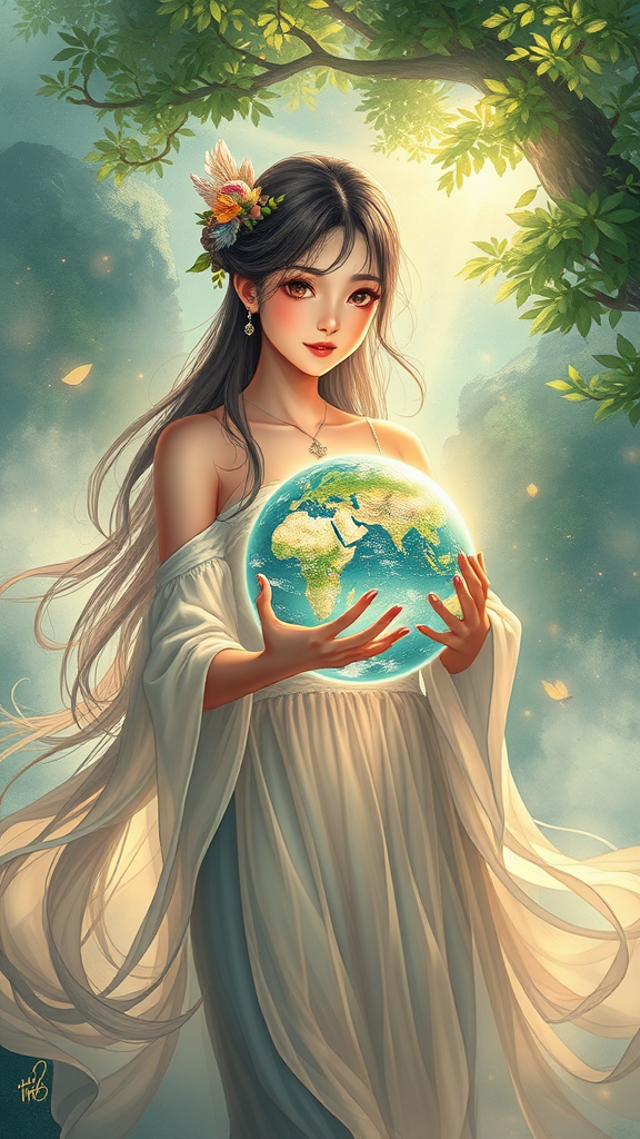 A young woman in an ethereal dress cradles a glowing globe, exuding an aura of earth goddess mythology. The scene, a striking blend of realistic fantasy and anime influences, captures her serene expression and connection to nature. The illustration features lush colors and intricate details reminiscent of Artgerm and Atey Ghailan, with the dynamic style of Guweiz. The artwork radiates with captivating beauty, blending elements of enchanting fantasy and vivid digital artistry into a spellbinding fantasy painting.