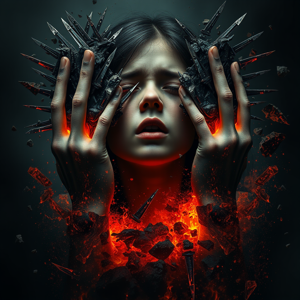A young woman in anguish, overwhelmed by sorrow, her eyes obscured by hands composed of multitudinous blades, her form fracturing into molten lava, disintegrating into the earth, fragments of her dissolving into the atmosphere, full-length profile, enveloped in darkness, rendered with hyper-realistic detail, surreal aesthetic, hauntingly beautiful, cinematic view, vivid emotional expression, high chaos and intensity.