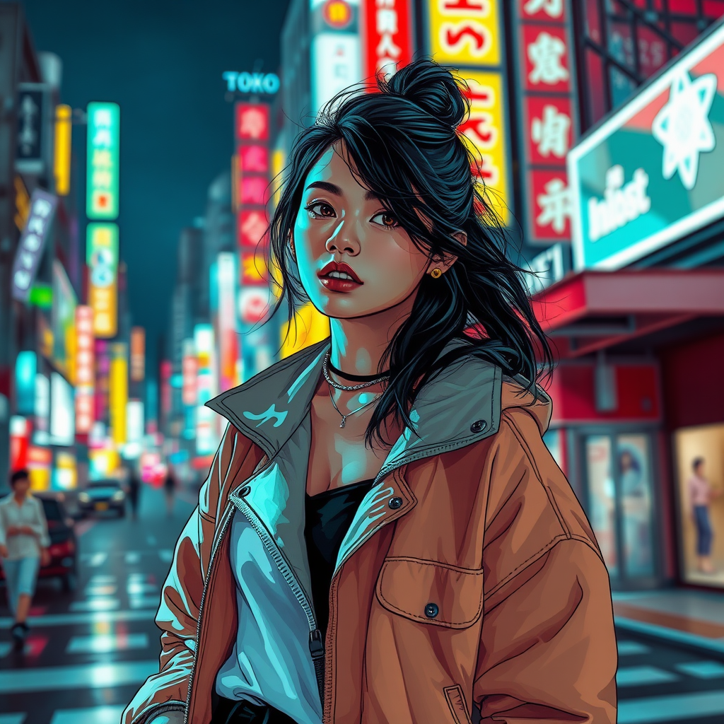 A young woman in chic streetwear, set against the vibrant backdrop of Tokyo's neon lights, showcasing breathtaking beauty with intricate, highly detailed design inspired by the styles of Carne Griffiths and Conrad Roset. This scene captures her in a dynamic pose, emphasizing precise line art and cinematic lighting, painted with the richness and depth of an 8k oil painting. The composition is centered and highlights her effortless elegance and modern style, ensuring a striking visual experience in high resolution.