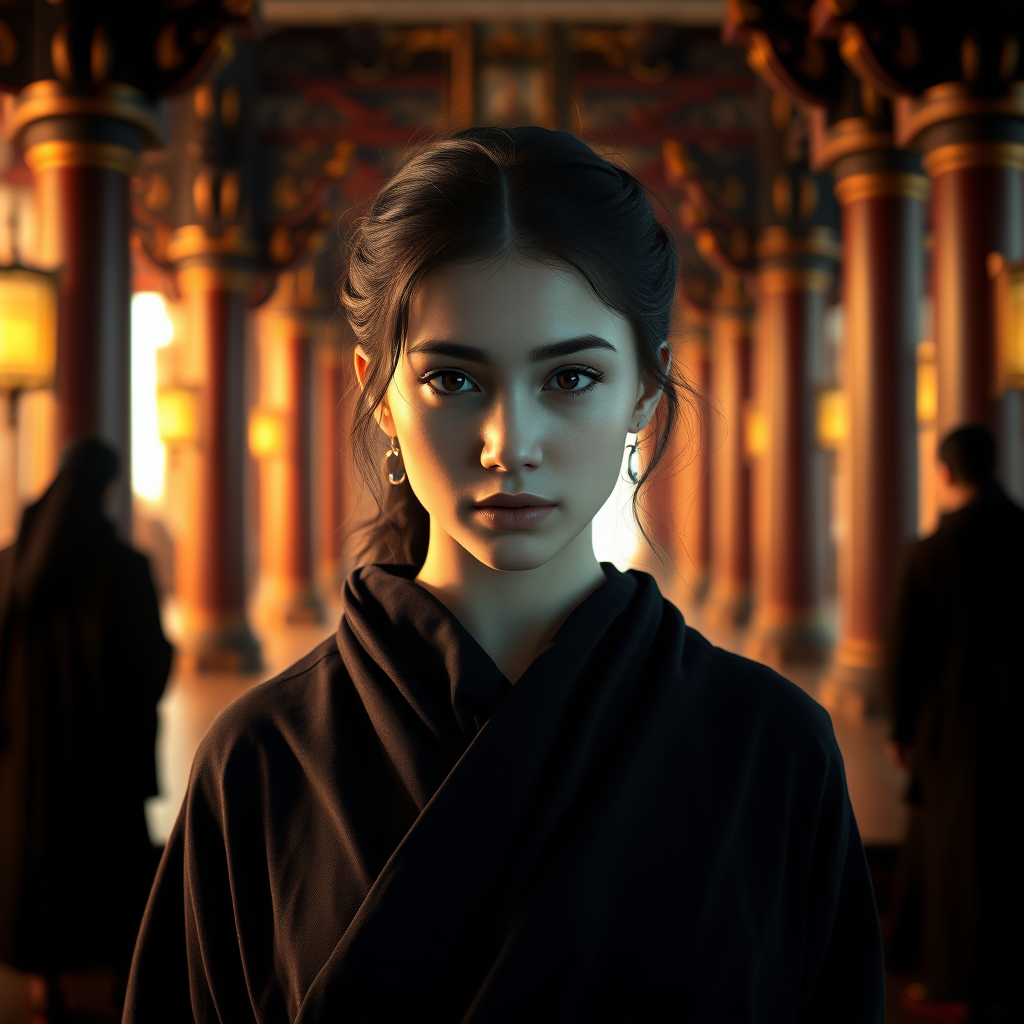 A young woman in dark robes stands in a temple, her symmetrical eyes catching the dramatic lighting that highlights the intricate details of the scene. Captured in realistic, high-definition sharp focus, the setting exudes an air of hyperrealism with complex textures emphasized by physics-based raytracing. Her dynamic pose adds a sense of movement, blending the worlds of digital photography and 3D art. The composition evokes the aesthetic of a hyperrealistic digital painting, seamlessly integrating elements of CGI with the artistic flair of a detailed illustration.