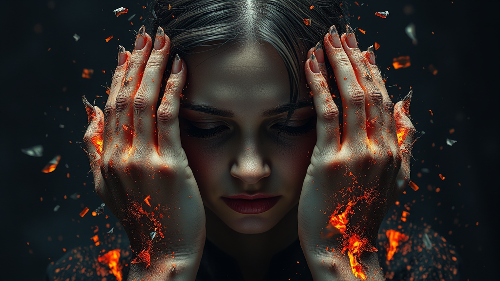 A young woman in deep sorrow, overwhelmed with grief, her eyes obscured by hands composed of countless sharp shards, her form fracturing into molten magma, disintegrating towards the earth, fragments of her essence ascending into the atmosphere, portrayed in full profile, set against a dark backdrop, capturing hyper-realistic detail, crafted with Unreal Engine artistry, hauntingly beautiful, cinematic aspect ratio energizing the scene with an unpredictable and chaotic allure.