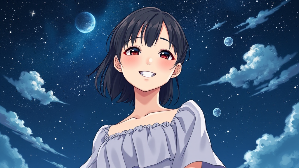 A young woman in delicate attire, illustrated in the style of Oyari Ashito, stands against a star-studded night sky. The portrait captures her expression of satisfaction and joy. In a manga and anime-inspired artwork, the scene utilizes dark exposure contrasted with vivid colors, highlighting her presence. The composition emphasizes fine detail and high quality, with a first-person perspective. Dark tones dominate, punctuated by the luminous glow of clouds and stars. The image features a tall, vertical aspect ratio, enhancing the serene yet dynamic atmosphere.